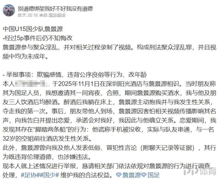 一锤到底,国足u15青训队天才球员詹景源事件迎来重磅后续,与女友交往期间多次私会32岁空姐,后续爆料额外4段不雅视频,这下是神仙难救了。