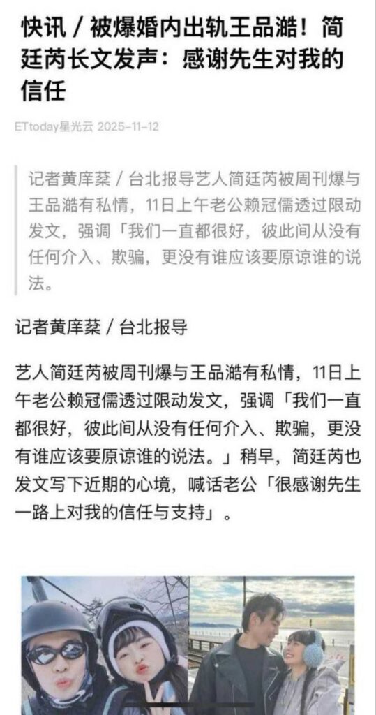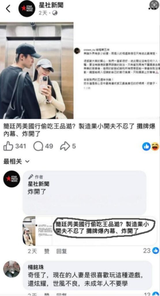 与粿粿事件相比,简廷芮的处置方式更引起争议——据称在被曝后,她仍在社交平台上发表感谢丈夫的文字,令公众与媒体议论纷纷。