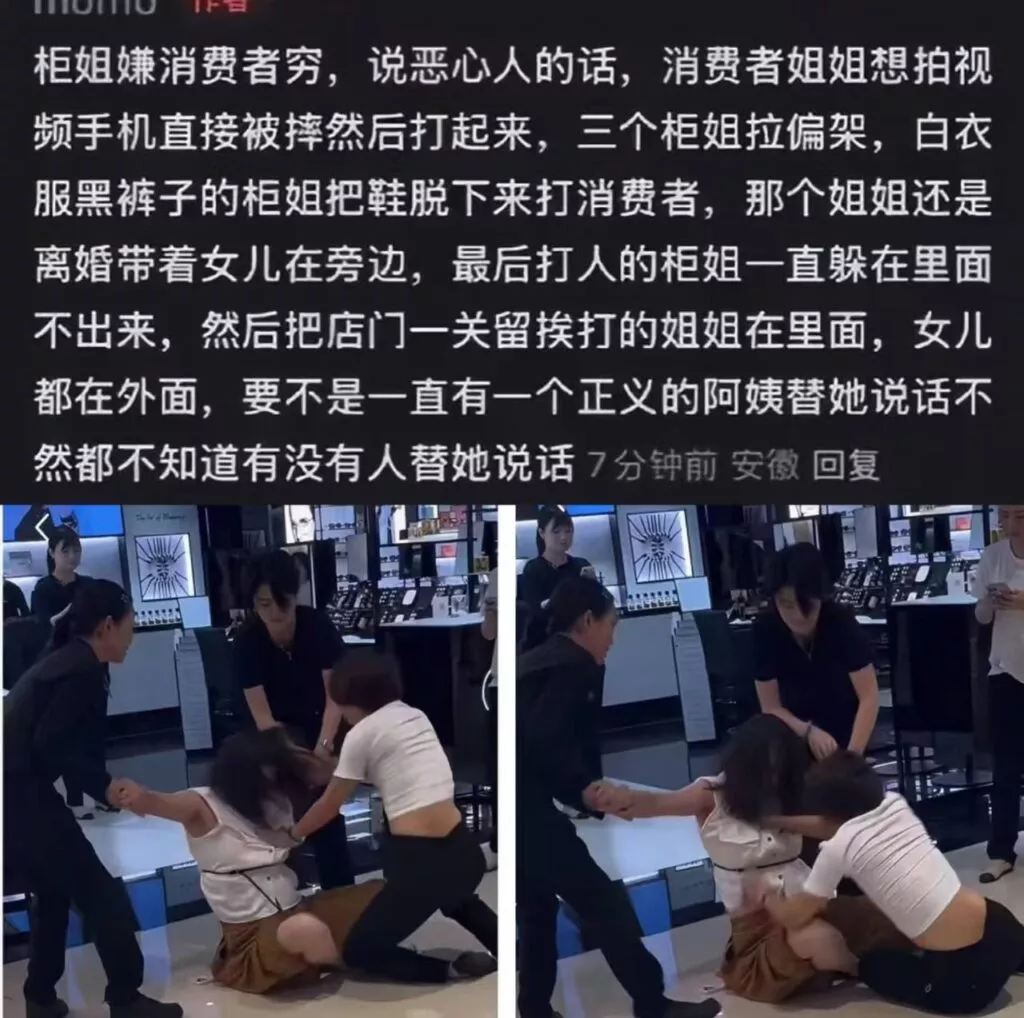 在肥万象城的香奈儿专柜,发生了柜姐与顾客间的肢体冲突。事件的导火索疑似是柜姐在私下里对顾客做出了不当评论,指责其经济拮据。顾客在录制视频时,柜姐情绪失控,突然对其进行攻击。此时,她的同事也一同参与,三人齐心对顾客进行了猛击,场面十分混乱。