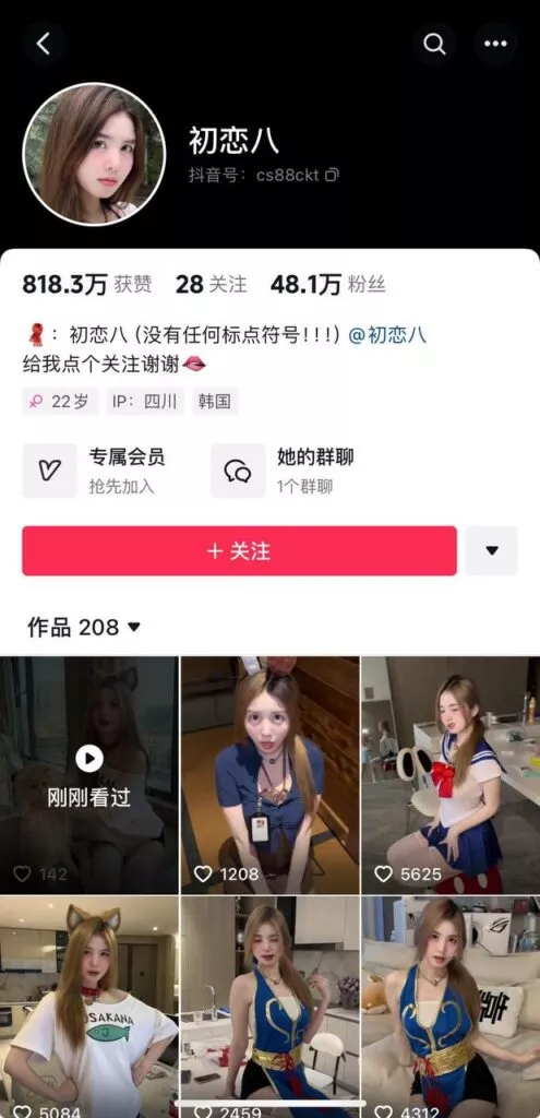 抖音上有一位拥有48万粉丝的顶级边缘网红,被人们亲切地称为“成都欠日姐”——初恋八。这位网红因其作品中常常展现出一种夸张而迷离的高点表情而得名。然而,随着时间的推移,她逐渐放飞自我,在边缘风格的探索中越走越远。