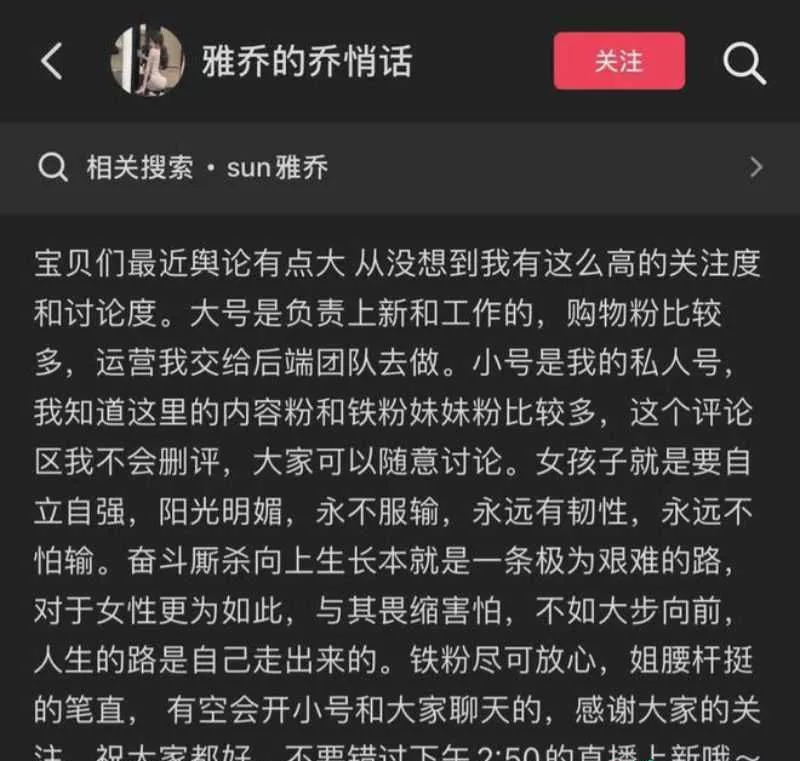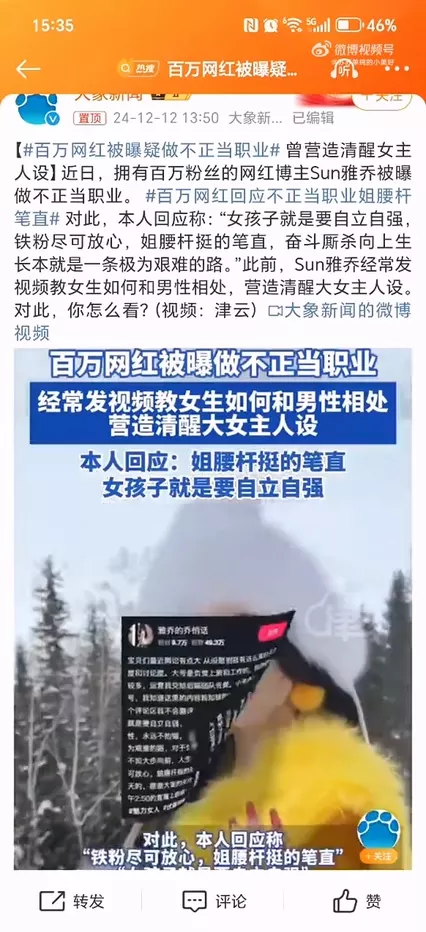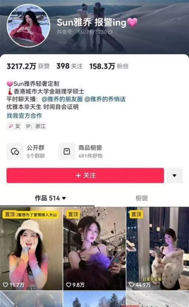 抖音上拥有158万粉丝的网红“Sun雅乔”,以清醒大女主的形象广受欢迎,时常发布视频教授女性如何与男性交往(其实是在谋求利益)。她曾经典地说过:“追求美好生活就一定是拜金吗?”然而,最近却被揭发私下从事不正当职业,疑似涉及外围女和缘交活动。