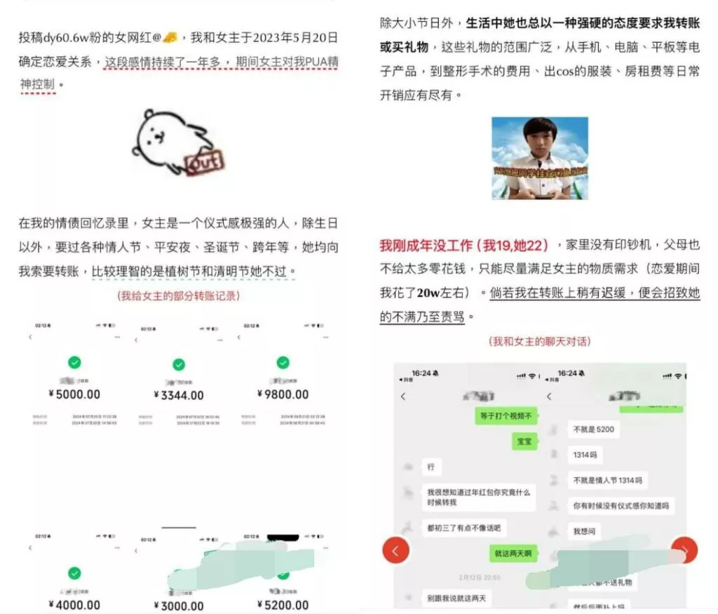 抖音主播起司被曝出PUA与精神控制行为,尽管外表纯真可爱,但内心心机深沉。她享受年轻身体的快乐,却把男友当提款机,疯狂压榨。在各种节日中,她强要求男友转账和送礼,若不如意则严厉讽刺。通过PUA手段,她牢牢控制住了这位缺乏社会经验的小男友。