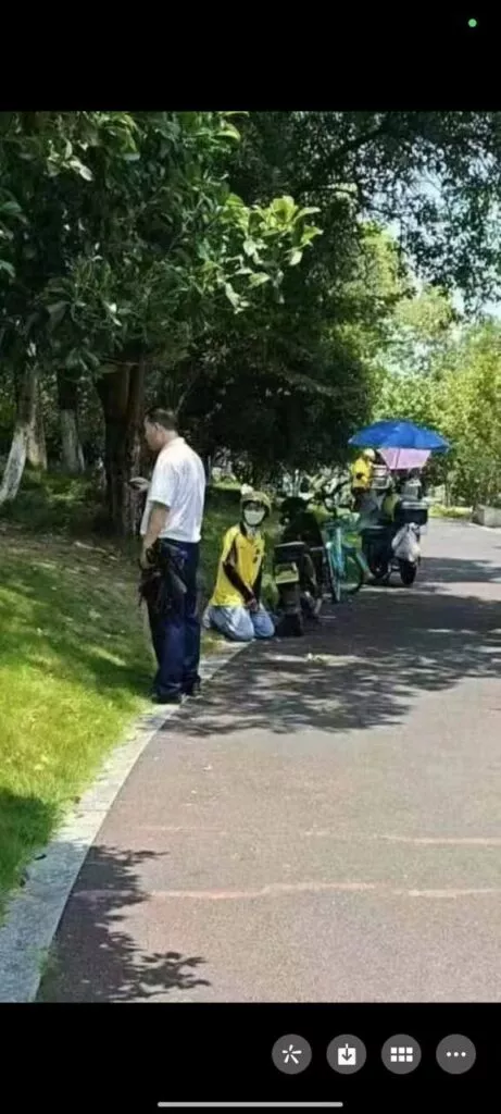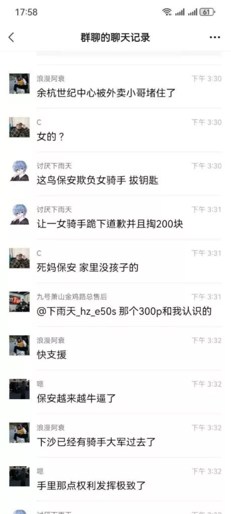 在杭州绿城西溪世界中心,一名普通的保安对一名外卖骑手百般刁难。这位外卖骑手是一名在大学放假期间兼职的女骑手,她被保安要求跪下道歉,甚至在罚款200元后,保安还将她的车钥匙拔走,并侮辱地称外卖骑手为“狗”。这一事件引发了杭州市超过一半的外卖骑手前来现场声讨这名保安。