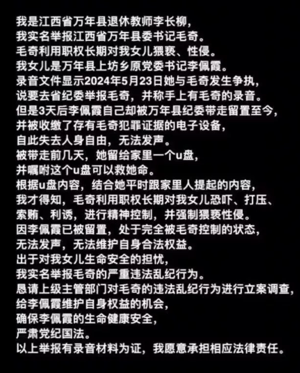 在江西上饶,一位退休人民教师近日在社交平台上发布了一段视频,为其下属李佩霞发声。他实名举报万年县县委书记毛奇,指控其长期利用职权对李佩霞进行压迫,并且更为严重的是,毛奇还涉嫌利用职权对李佩霞实施性侵。