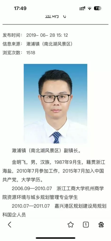 浙江嘉兴澉浦镇副镇长金明飞私会出轨人妻当场被抓