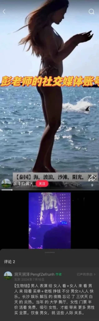 然而,后来学生们发现这位教授的社交媒体账户,温文尔雅的彭教授在社交媒体上的形象却截然不同——不仅有热辣舞曲的舞娘,还有他与美女在KTV尽情热舞的视频,并配以“文化渊博”的评论。此外,彭教授还频繁分享性感美女的视频,实在让人感到震惊。甚至其在社交媒体上的评论发言,也实在是有伤风化过于极端,很难与一位高级教授的形象联系起来