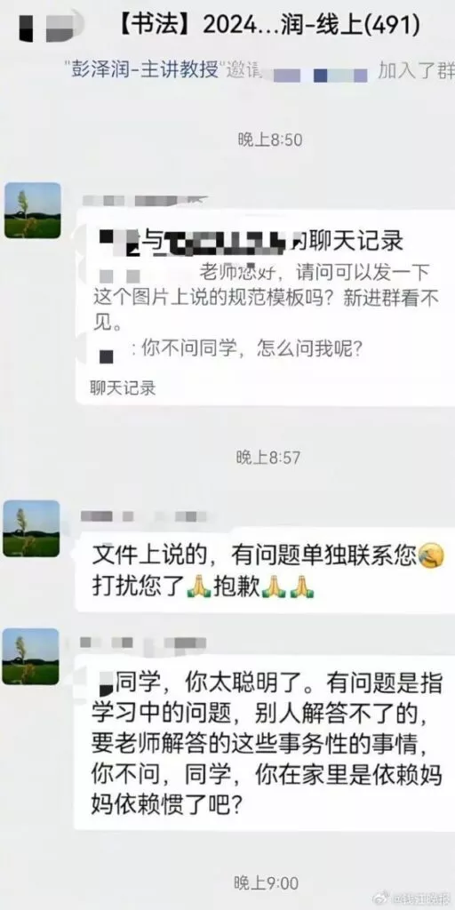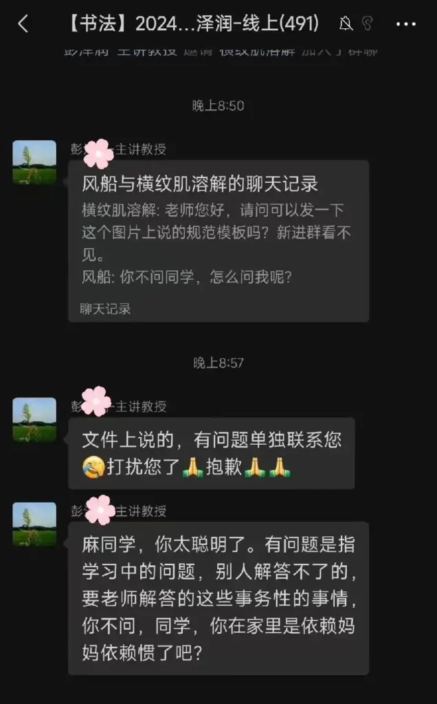 湖南师范大学文学院的教授彭泽润在学生私下询问作业问题时,竟将与学生的聊天记录公开发布到近500人的课程微信群,并指责该学生:“你难道在家里一直依赖妈妈,已经养成这样的习惯了吗?”