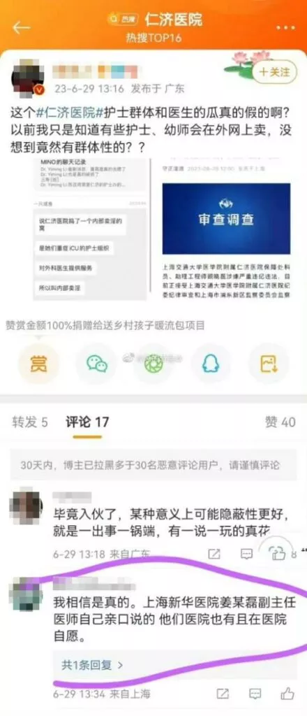 近日,有网络传言称上海交通大学附属医院仁济医院的外科医生参与嫖娼,更有爆料指称该医院某科室涉嫌集体组织卖银活动。据悉,仁济医院内部调查发现ICU科室的一名护士确实存在组织卖银行为,并为外科医生提供性服务,甚至涉及多人银乱聚会。对此,仁济医院迅速发表声明,强调这些消息为不实信息,极有可能是谣言。