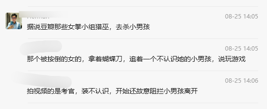 8月24日,一段视频再度引爆社会舆论。网传广州海珠区极端女权组织女性上街随机伤害男孩,视频中两名男性与拍摄视频的女主发现小男孩被一名手持刀具的女性不断搔扰B近,果断采取措施制服这名暴徒