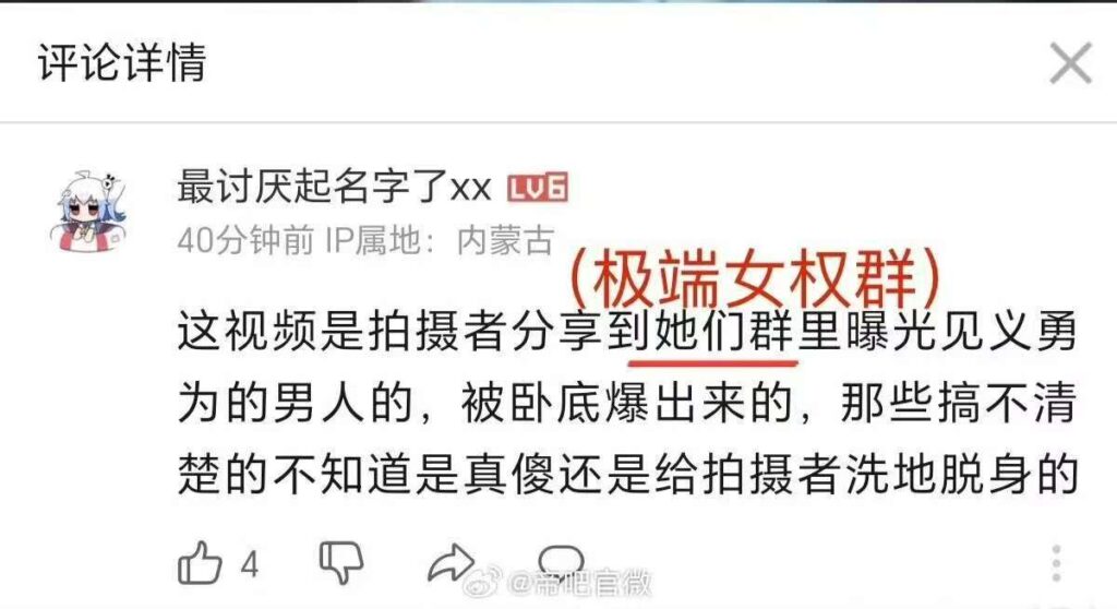 随着事件不断被解读,以及关于性别对立等事件的敏感性,话题一度冲上热搜,然鹅,当事的两名男性发出视频证明,视频拍摄者是与他们2人同行的朋友,那名刀女和她并无任何关系。