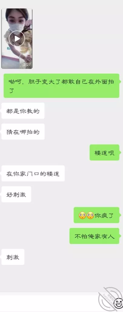 今天正上着班呢,邻居发来一个视频,一个在楼道里自愉的视频,他妈的还是在我家门口,这娘们胆子越来越大了,我都不敢在她家Cao她,你胆子大的跑我家门口自愉,之前她家里没人的时候叫我去她家好几次,去的时候兴致勃勃,要做的时候瞬间垂头丧气,不是小弟不行,我真怕被堵家里面,会死人的。