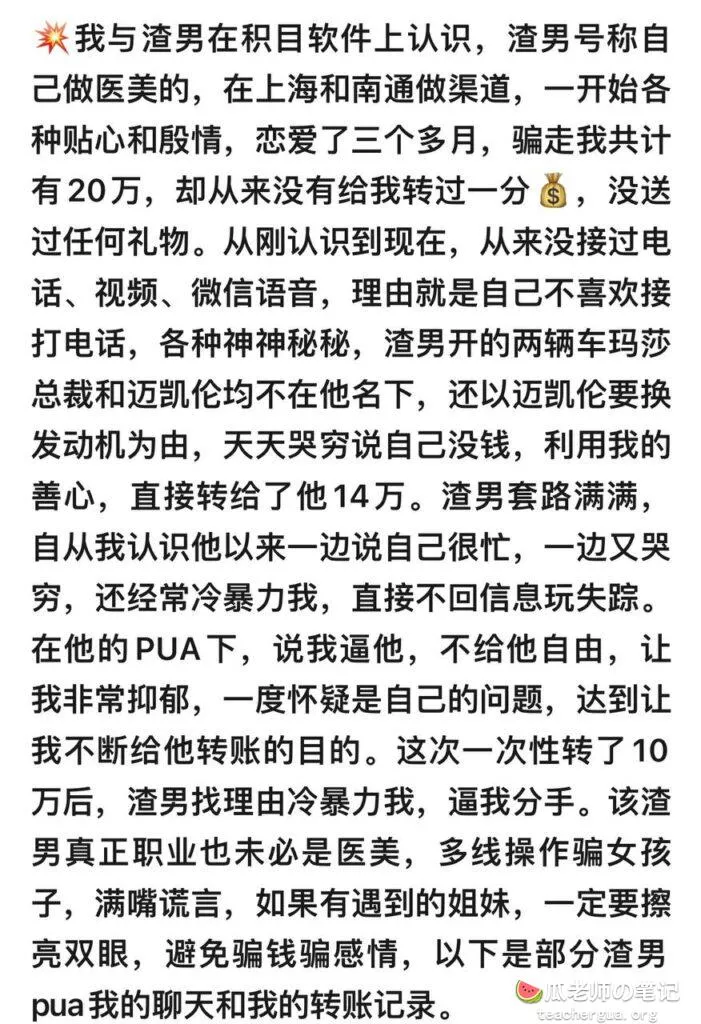 曝光一个渣男,号称医美渠道大拿,开着玛莎拉蒂和迈凯伦,但实际渣男是专业PUA,欺骗了不知道多少位女生,相关内容如下,网恋需谨慎,保护好自己