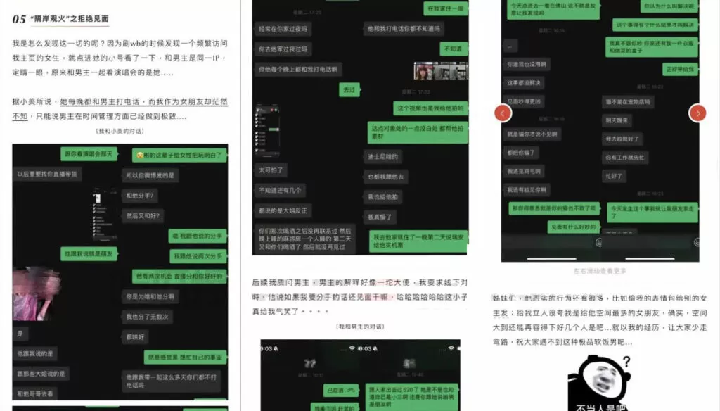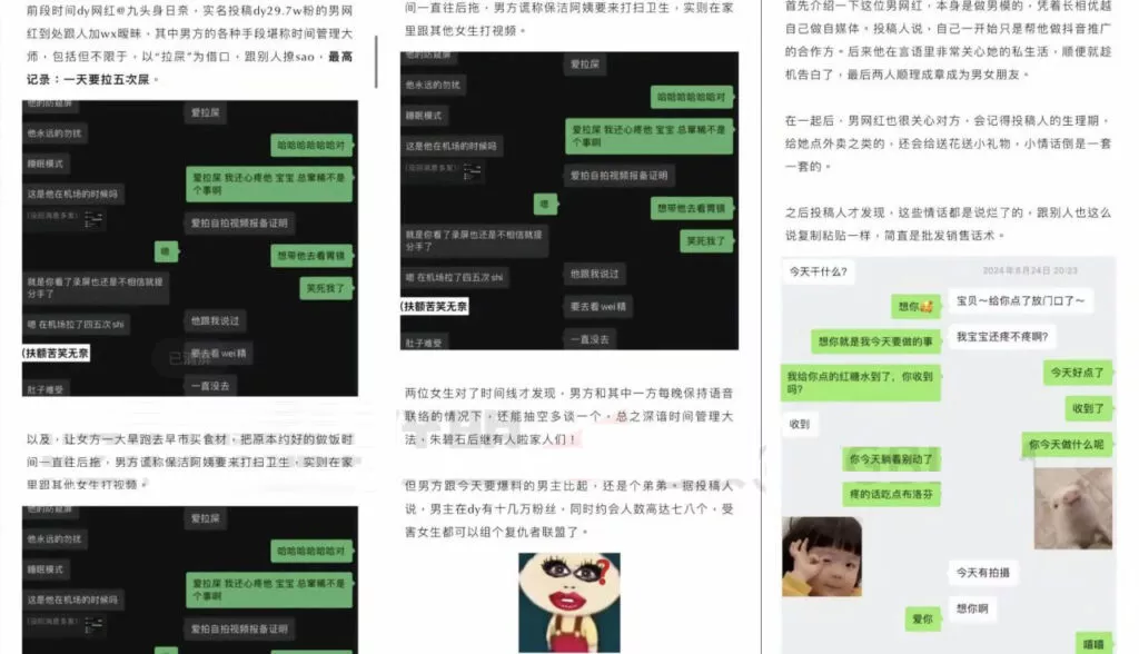 抖音女网红九头身日奈9m近日实名举报男网红于谢顶,指控其背弃爱情,与多名女性保持暧昧关系。她揭露于谢顶欺骗感情,还在与女生视频聊天时轻佻。震惊的是,他在开房时使用女方身份证,并为了掩盖劈腿行为谎称“去拉屎”,在机场短时间内声称“去了五次”。