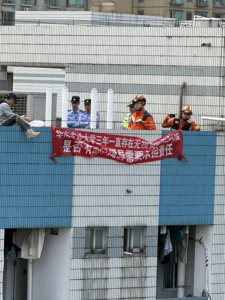 广州华南农业大学在11月9日发生一起引人注目的事件,一名学生站在学校天台上试图跳楼,表达其对食品安全问题的强烈关注,声称要用生命来为师生的食品安全发声。校园内到处张贴着各式各样的海报和横幅,传达着对食品安全问题的不满与控诉。