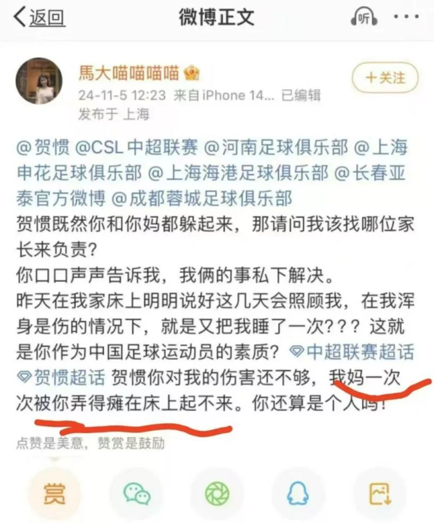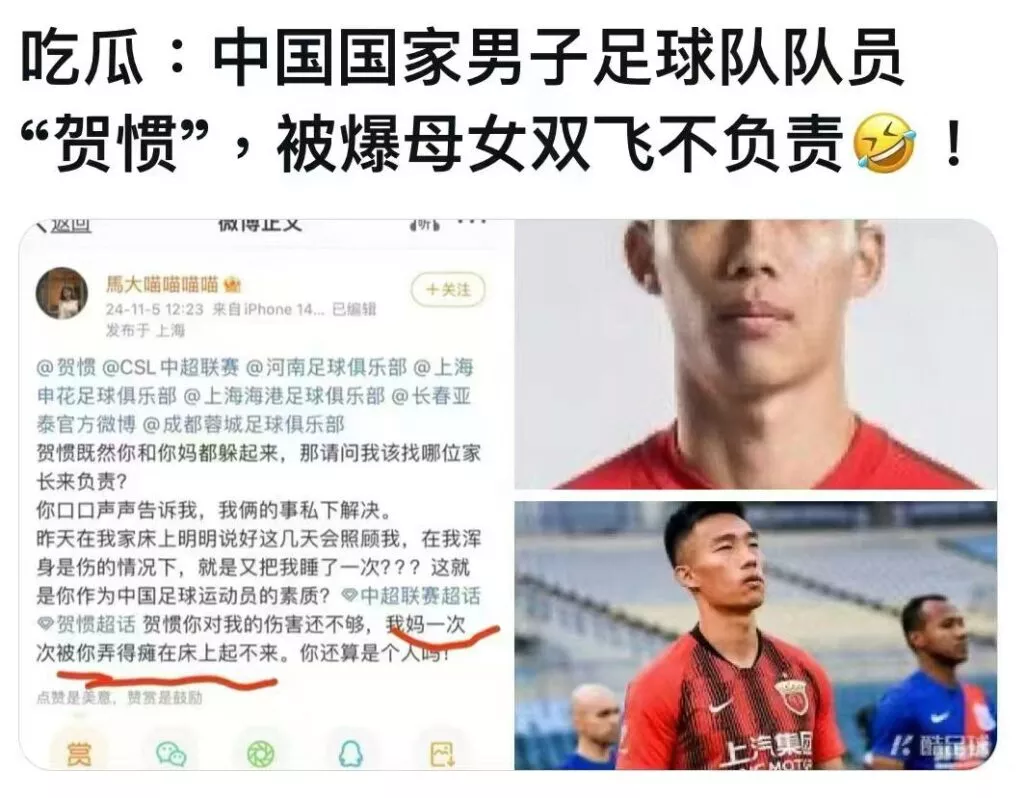 31岁的中国国家男子足球队球员贺惯近日被爆出与一名美女有染,甚至卷入了令人瞩目的「母女双飞」事件。据传,贺惯还对女方的母亲施以辣手摧花,导致她瘫在床、无法起身。吃了多少海参能有这种力气,这牛劲不用到踢球用到这里!