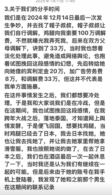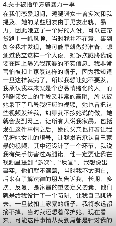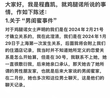 此后,在经过鸡腿诺一通曝光后,男主程鑫凯目前也抖出更多猛料,称鸡腿诺曾多次失恋去陪男闺蜜,鸡腿诺利用不小心自己碰到的伤痕去装作被家暴凹人设。