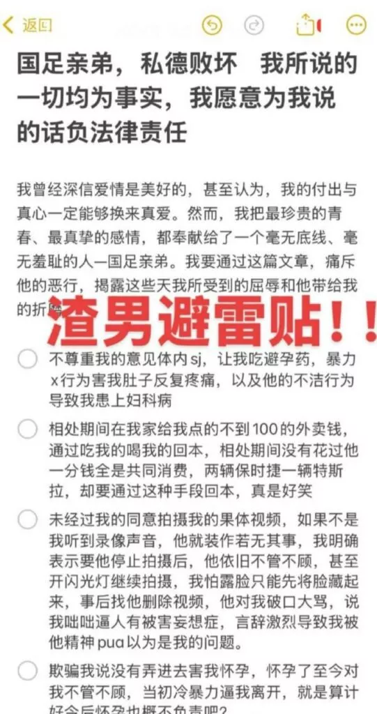 2025年国足首宗丑闻现身!现役国脚张玉宁的弟弟张玉全,仅21岁,便获得了“百人斩”的不光彩称号。传言他在与女生产生关系后,得知对方怀孕,却选择消失并对此事闭口不谈。苦主无奈曝光此事才发现,在和自己交往时,此人多次出轨约炮多达百人。