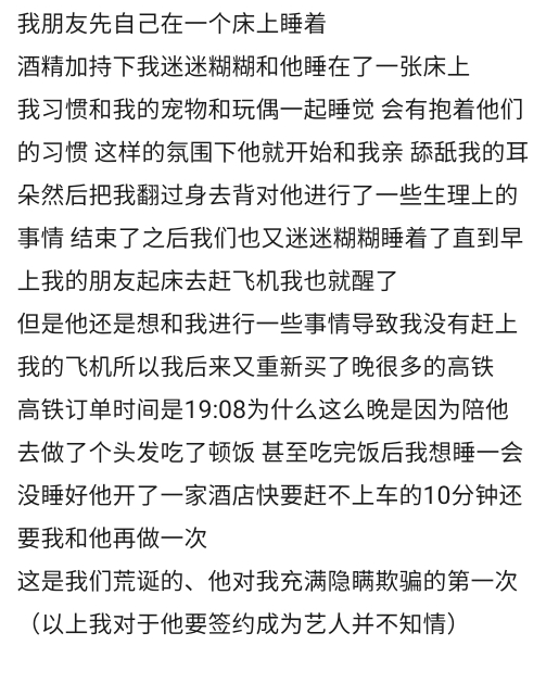 男网红刘先贺在发出一段接近3小时的自我澄清公告大致疑似就是自己是纯洁的,并没有任何pua和越界行为,也不存在任何脚踏多只船睡粉行为后,苦主继续加紧曝猛料
