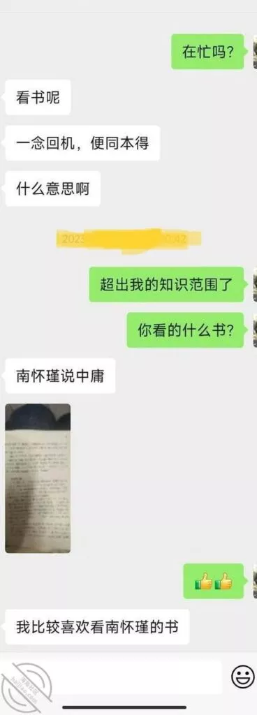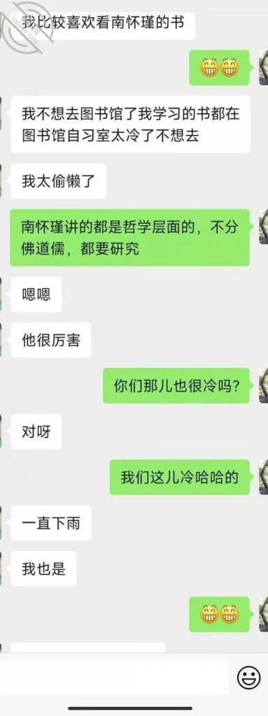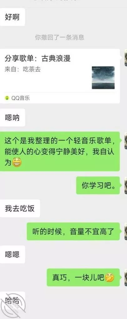 下面是聊天记录海友们有兴趣可以看看(为了安全我把时间头像都截了,海友勿怪),其实没什么好看的,聊天内容就是看什么书啊,听什么歌曲啊,嘘寒问暖什么的,真的应了网上那句话,前期人生理想后期诱惑伦理,不过我还没到后期呢。