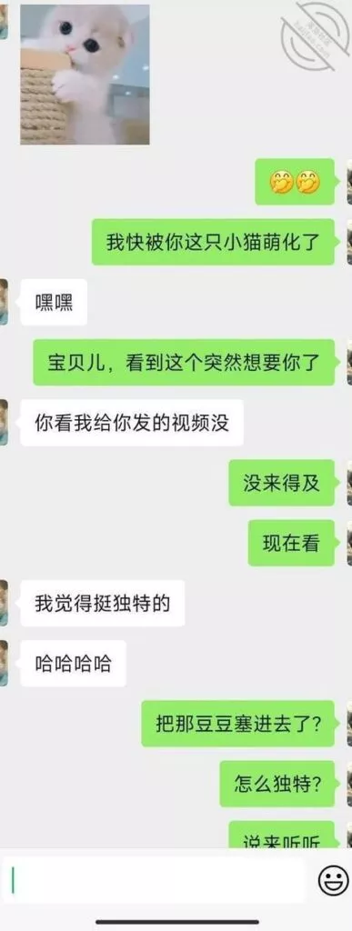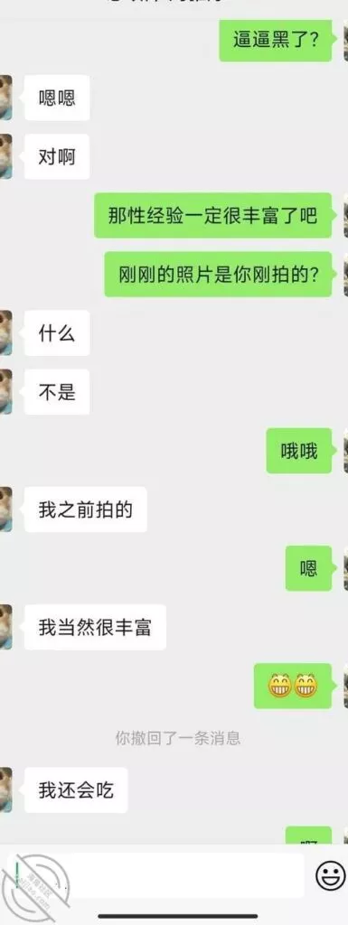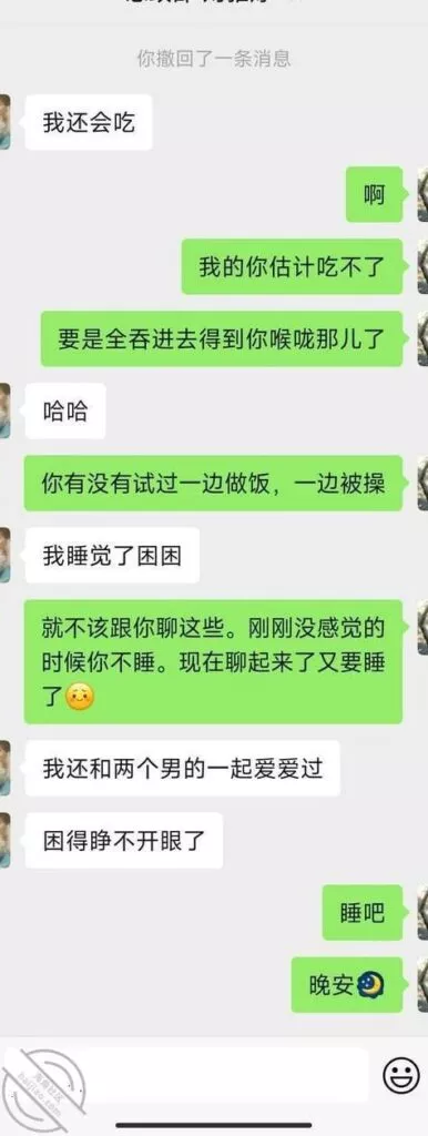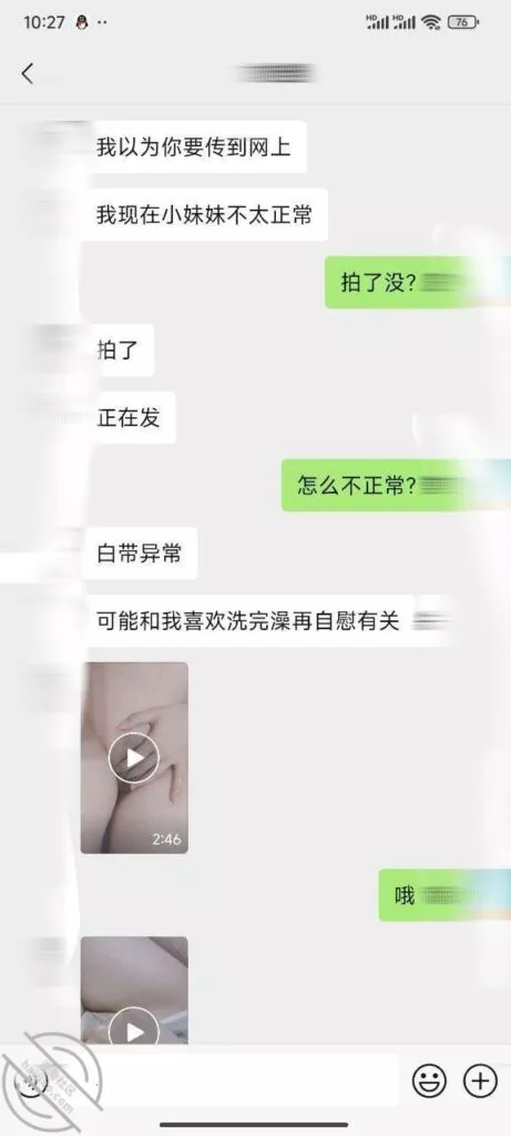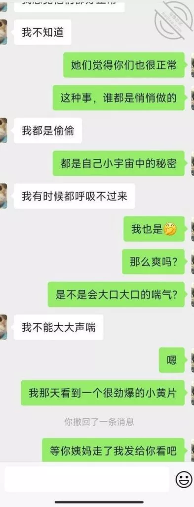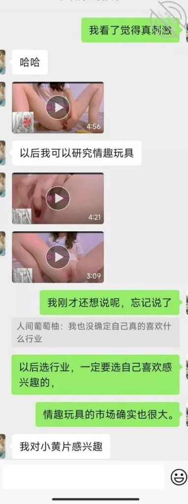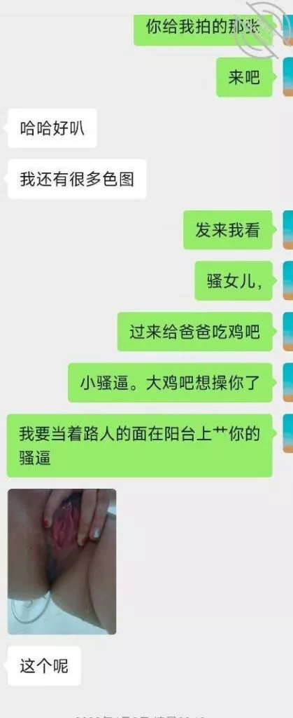 说一下大致情况吧:我现在用小号已经开始和妹妹撩搔了,而且是异常的顺畅没有任何的反对我以为是陌生人的原因妹妹才如此的肆无忌惮,可是越聊后面我发现是我错了,我一开始就错了她不仅做过爱,还和两个男人做i(最后一张截图),宛如一个母狗模样,期间我问她比比什么颜色,她说“已经黑了”(玛德感觉还挺骄傲),原来在我面前一副清纯乖乖女的样子都是装出来的,聊完她去睡觉了我却怎么也睡不着。