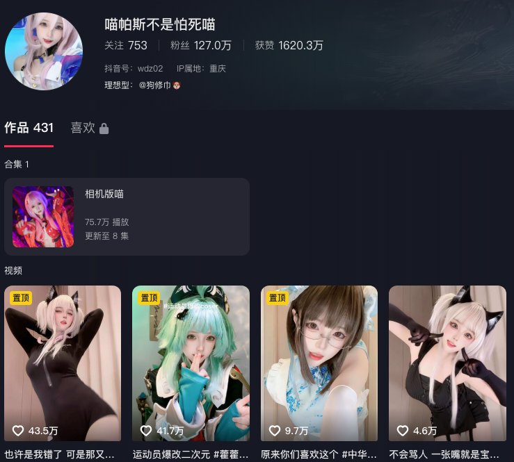 抖音127万粉丝擦边网红coser喵帕斯付费大尺度福利幽灵娘小心被盯上哦