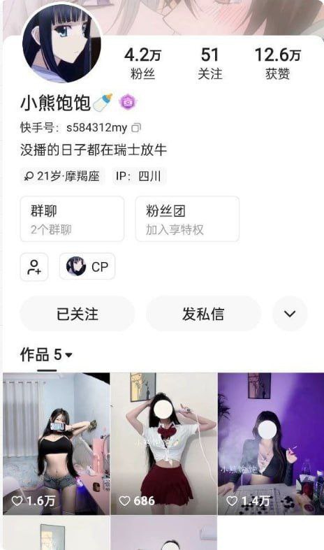 快手主播“小熊饱饱”拥有约4万名粉丝,以姣好身材和带有挑逗意味的风格吸引关注。近日网络上传出疑似其尺度较大的私拍视频。