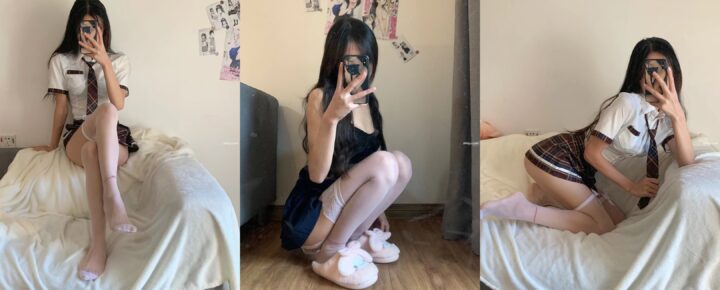 这位美女穿着黑色制服风连体装,搭配蝴蝶结与细腻剪裁,让你一眼就能感受到她那性感而优雅的魅力。特别是她那些令人垂涎欲滴的灰色长筒袜,更是勾勒出了纤细修长的双腿,完美融入整体造型中。