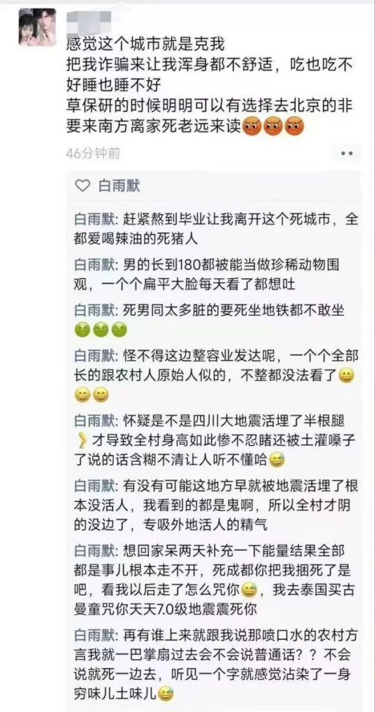 汶川地震不仅是四川的伤,更是整个中国人最不愿提起的事,多少家庭因为地震破碎。但一位名叫白雨默的来自西南财经大学的学生,却在朋友圈发布逆天言论,拿着地震开玩笑,甚至诋毁成都。