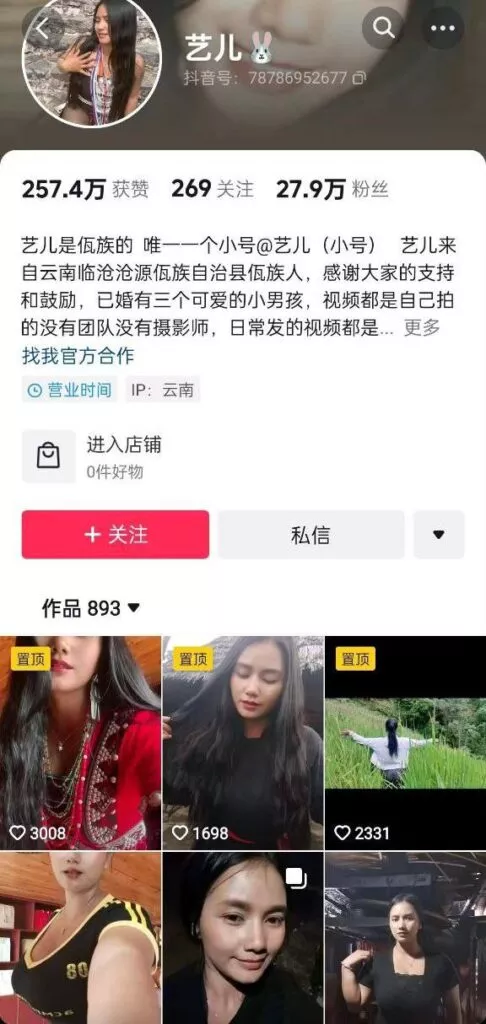 一位来自佤族的少数民族网红,昵称为艺儿。她的显著特点是丰满的匈部。她自述已有三个孩子,但自从掌握了流量密码后,她开始在直播中挑战底线,频繁展示性感元素,并进一步涉足私人拍摄和福利内容。