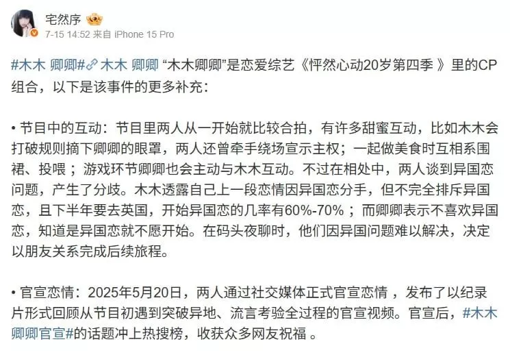 根据网友爆料,网红情侣cp木木与卿卿看似恩爱,实则表面关系。尽管在直播中表现甜蜜,私下却混乱。近期视频显示,木木频繁与不同女性约会,而卿卿则通过编造虚构人物来欺骗粉丝,获取礼物与支持。