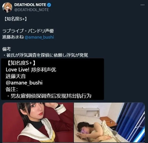 进藤天音是一位2004年出生的年轻声优,甜美可爱的外貌令人印象深刻。她不仅为2.5次元少女乐队企划《BanG Dream》中的仓田真白配音,还在《Love Live》中担任桂城泉的声优。凭借其甜美的形象与可爱的角色设定,自出道以来,她一直是二次元领域中最受欢迎的偶像。然而,令人意外的是,她的男友雇佣侦探,抓住了她出轨的确凿证据。