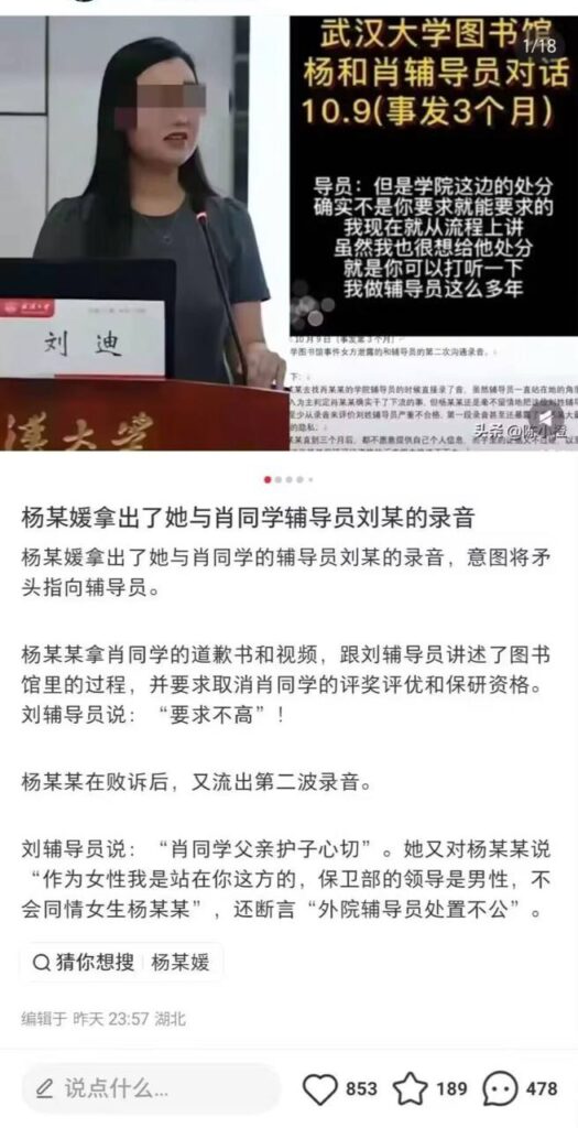 背刺恩师?武汉大学图书馆事件杨景媛曝光录音出卖辅导员刘迪