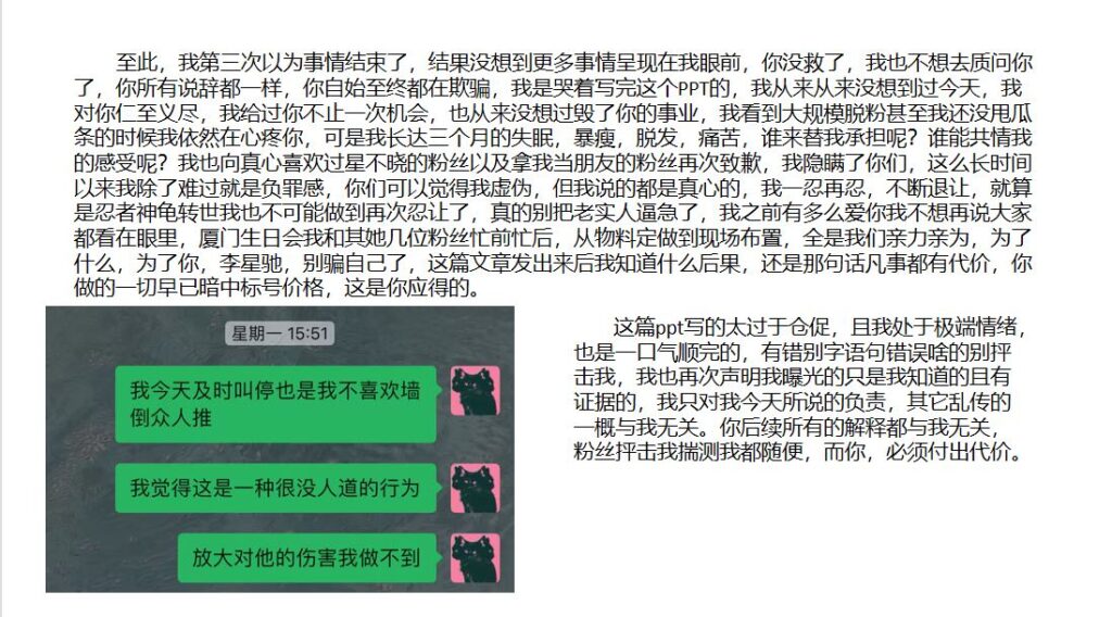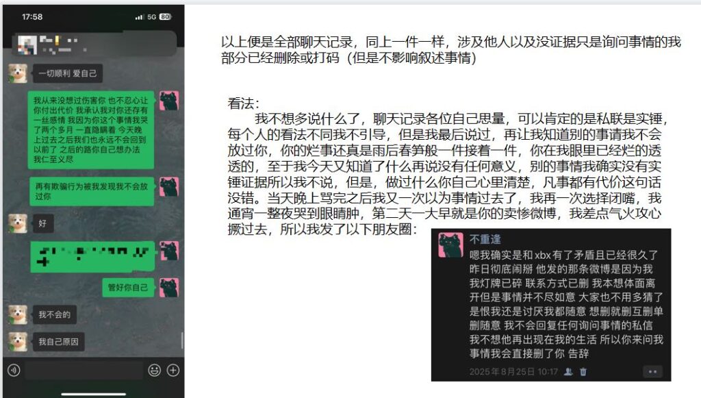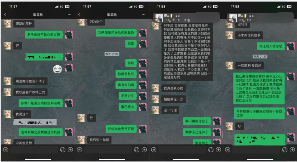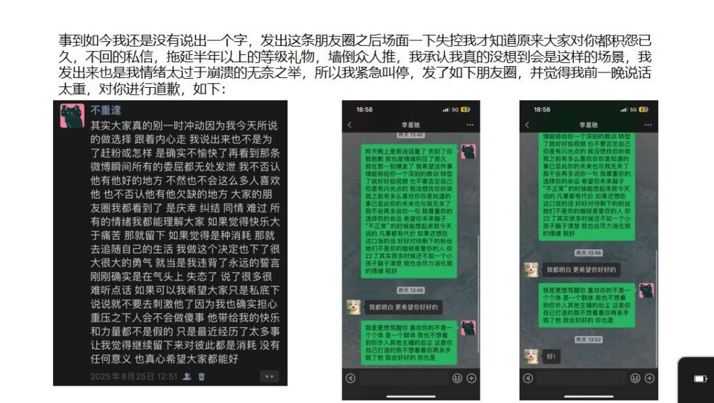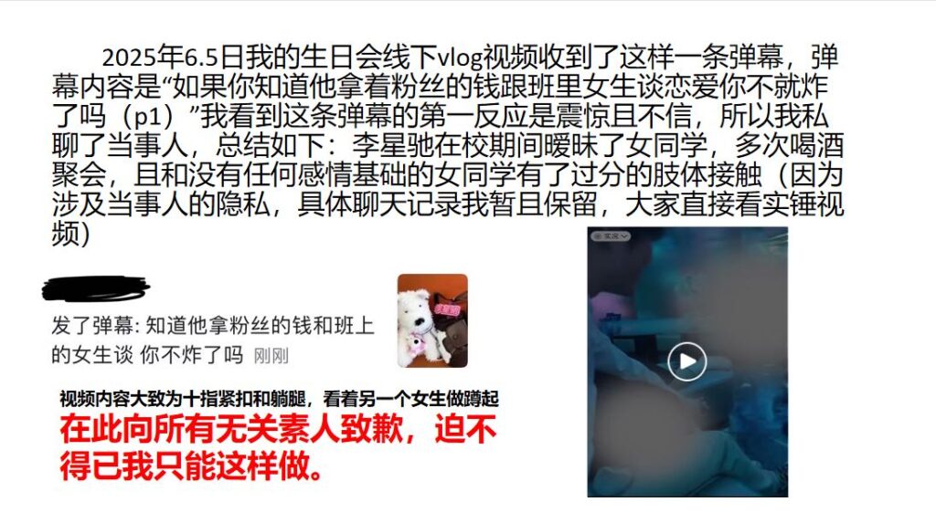 这位男网红打着“单身”人设,靠粉丝打赏维持流量,却在学校里与女生暧昧不清,还与榜一那位女粉保持若即若离的关系。后来那位榜一女粉揭露真相,发布长文并配上PPT,愤怒指控他是个两面派渣男。如今,这位在抖音拥有280万粉丝的男网红疑似已“塌房”。