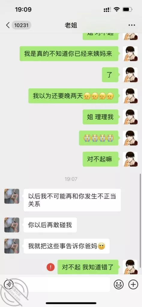 后面我左思右想觉得自己太不是人了 我给姐姐发微信道歉 可是姐姐不理我 我以为她在休息 然后过了会又给她发信息 她告诉我以后不可能在和我有不正当的关系 还告诫我以后不要碰她 不然她就把我和她的事告诉我爸妈 说完还把我拉黑了姐姐估计是真的厌烦极致了我 兄弟们怎么办 我不想失去这么好的姐姐 而且我心里头真的很难受很难受…
