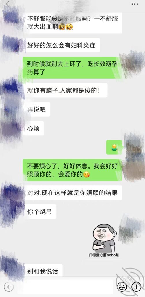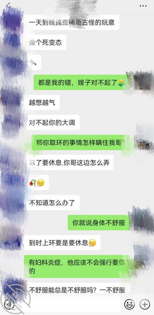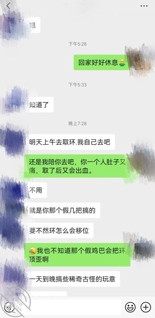 今天早上我发微信给她想约她中午吃饭后去酒店,她和我说小肚子很痛,下午我就陪她去了隔壁城市的医院检查,因为在本市怕碰到熟人,她明天要去医院取环了,从微信聊天记录看她有点生气了。早上我想约她中午吃饭,吃饭后去酒店。