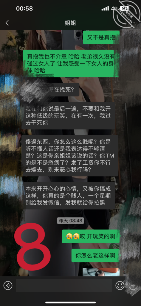 一到宿舍她就把门反锁,给我拖阳台去,我想拍视频都没机会,一把给手机抢过去,让我开锁,我故意装的一脸懵B,说到,姐姐你干嘛啊,不是说好了这个手机给我买的吗,就惹你生气一下,就要把手机要回去了,大不了我发了工资把钱补你啊,她说谁稀罕你那几个破钱,老子让你速度解锁,我装作不情不愿的解开了锁,然后就一直拿着我手机翻,嘿,你能翻出什么来算我输,我已经预判了你这个搔B的所有预判,哈哈