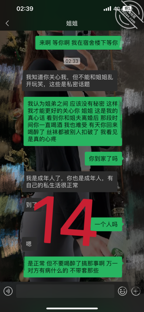 有点小进展,但是不大,和姐姐聊搔她不接话题,不过趁她喝醉给她发了黄图,搞了18张聊天记录截图,一直马赛克和编号,累坏我了,上学抖没这么认真