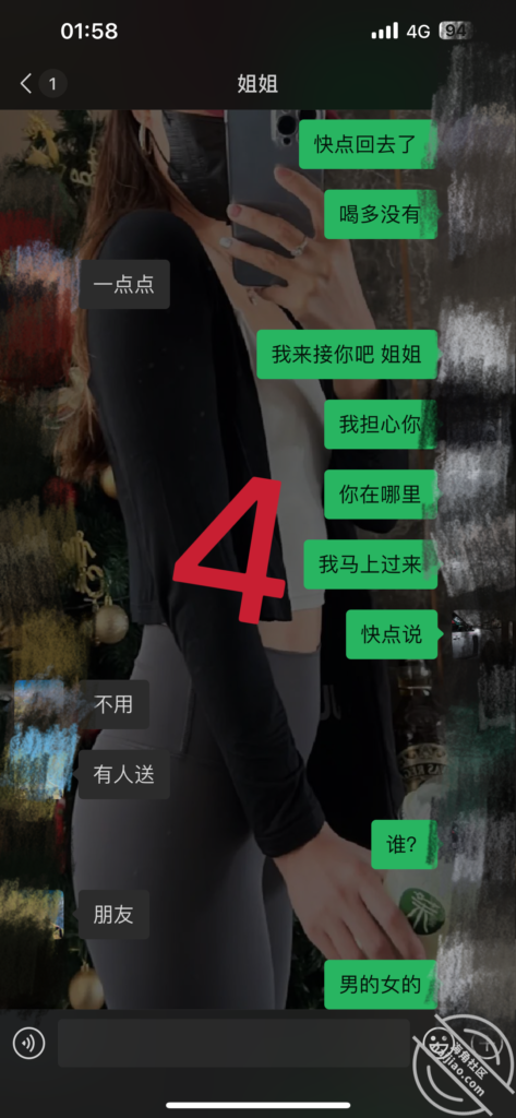 昨天早上就给她发信息一直没有回复,不知道忙什么去了,晚上才回我,一回就说在喝酒,这让我看见了一点机会,以关心点名义一下问她在哪,我去接她,搔B一直不说