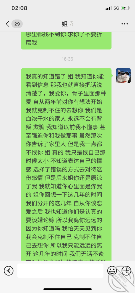 姐姐才对我说,你这些年的变化,对我什么样,我心里面都清楚,但是我们这种关系,我真的很头疼,说实话我努力去接受了,但是我过不了心里面这道坎,说完我就失望了,心寒了,我说姐真的一点希望都不给我吗?我们就像短暂的恋爱关系一样,试着相处都不行吗?试试都不行吗,说着说着我直接声泪俱下了,这不是演戏,那时候我是真的很绝望啊,姐姐看我这样,也是心软了,说你让我好好考虑考虑,然后就回房间去了