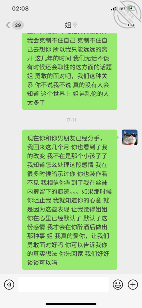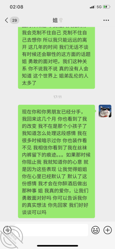这就是大概的聊天记录,我索性直接明牌了,打直球,已经几年了,我相信姐姐也知道我的心思,我在去掩饰,在去做作,我觉得完全没意义了,直接说,看姐姐什么反应,行就行,不行我就离开,就这么简单,没必要这样互相折磨了,所以 一开始我都是卑微的求她,道歉,后面我觉得反正做了,上次道歉有用回来了,可是回来我就给姐姐Cao了,这次在道歉,意义已经不大了