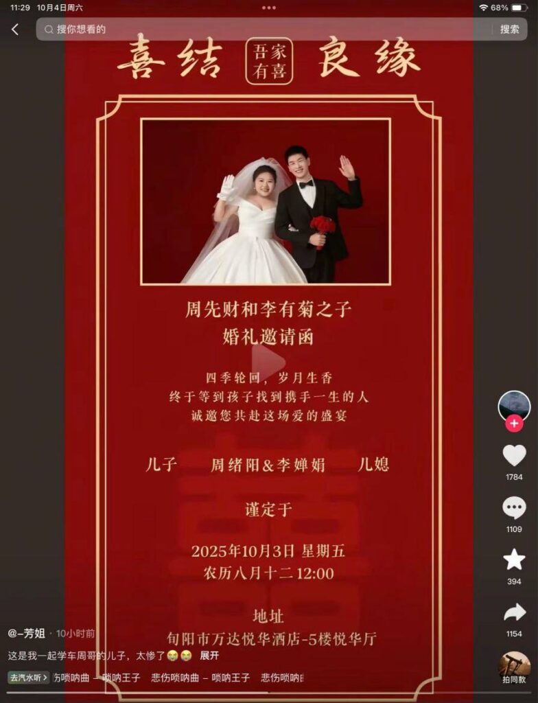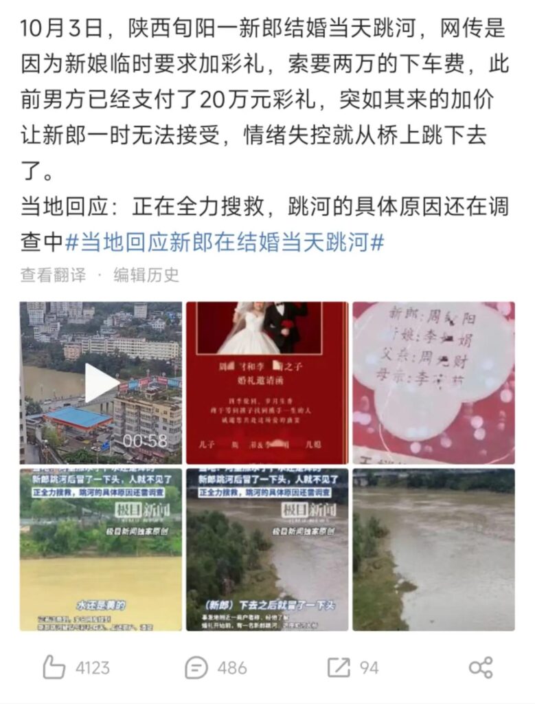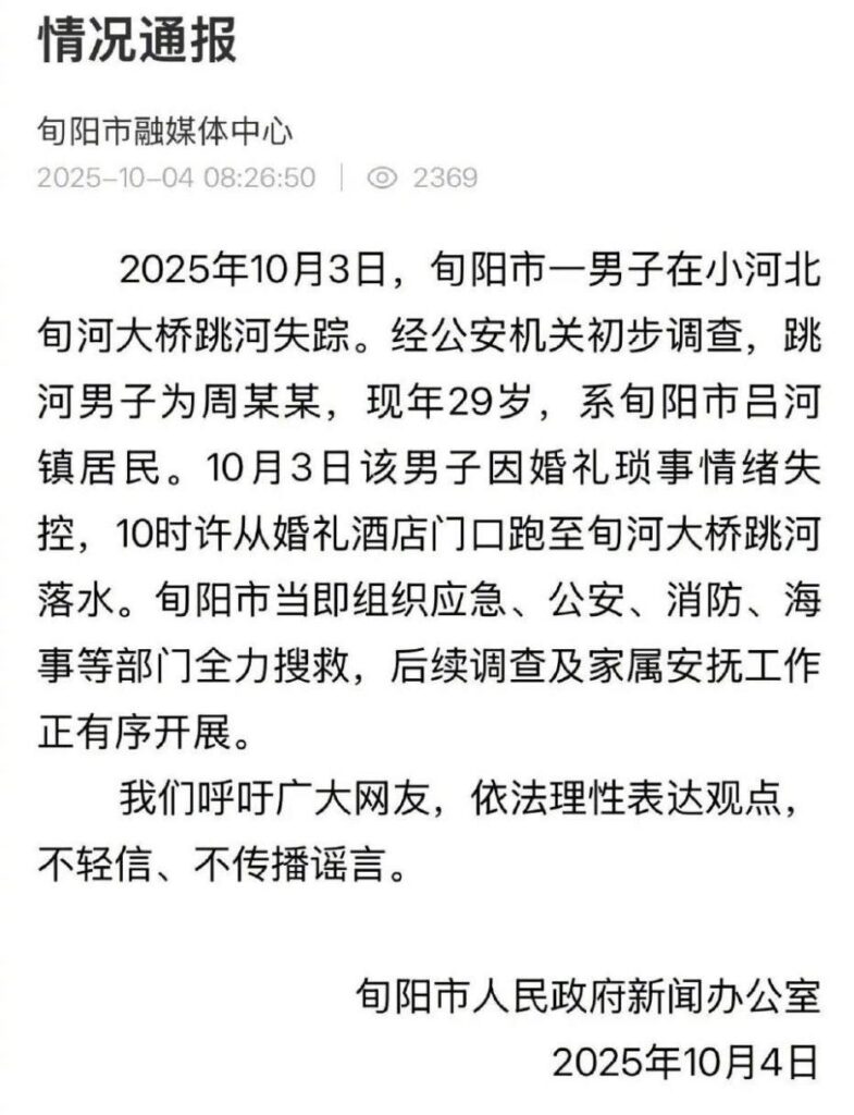 陕西安康旬阳(小河镇)发生一起令人痛心的事件:婚礼当天,新郎跳河身亡。據当地人反映,事发缘由与女方母亲在新娘上下车时反复索要彩礼有关,称“彩礼不够就不成亲”,双方争执后,新郎情绪失控跳河。具体细节与原因尚待官方进一步核实。