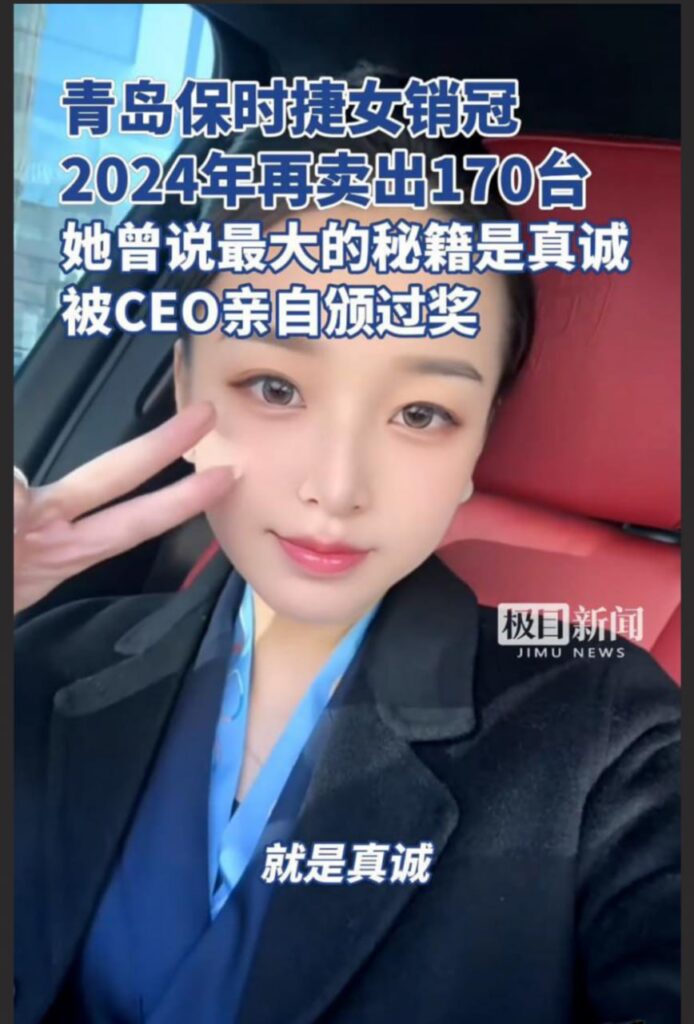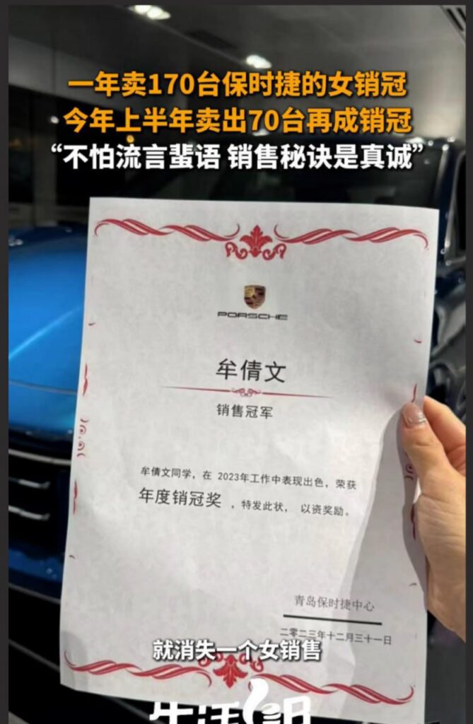 青岛保时捷中心女销冠牟倩文,自从以一年卖出170台车登顶销冠后,再度取得年中销售冠军,而最近更是被传出丑闻,出卖色相换取业绩,迷之通话录音更是令人想入非非。
