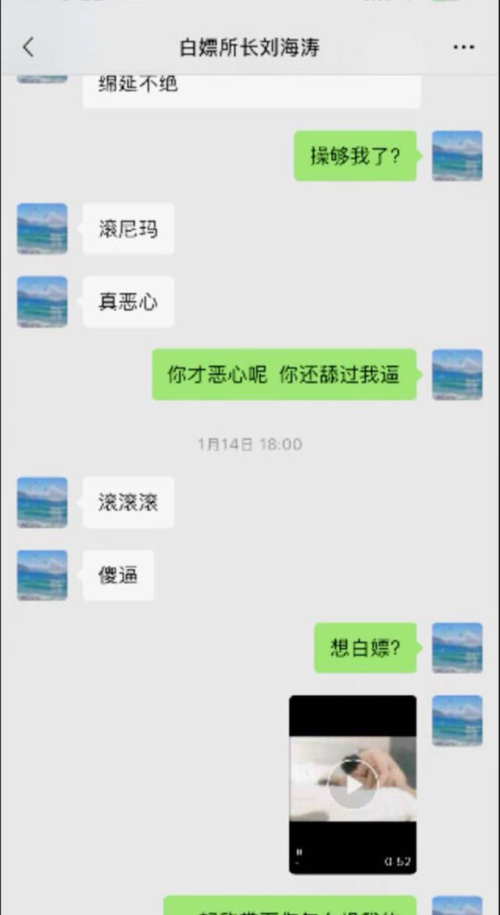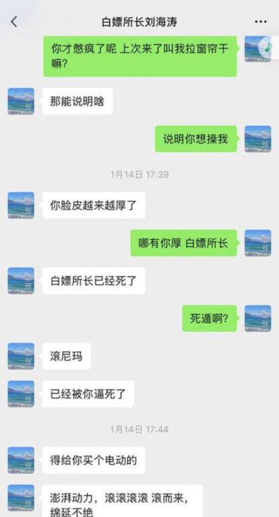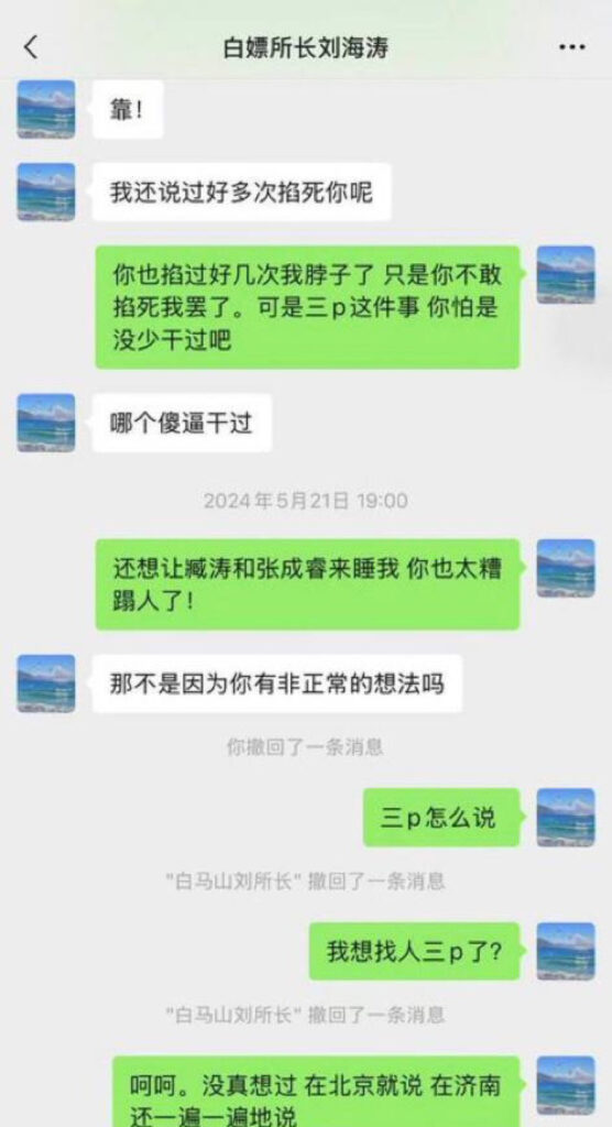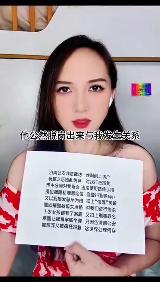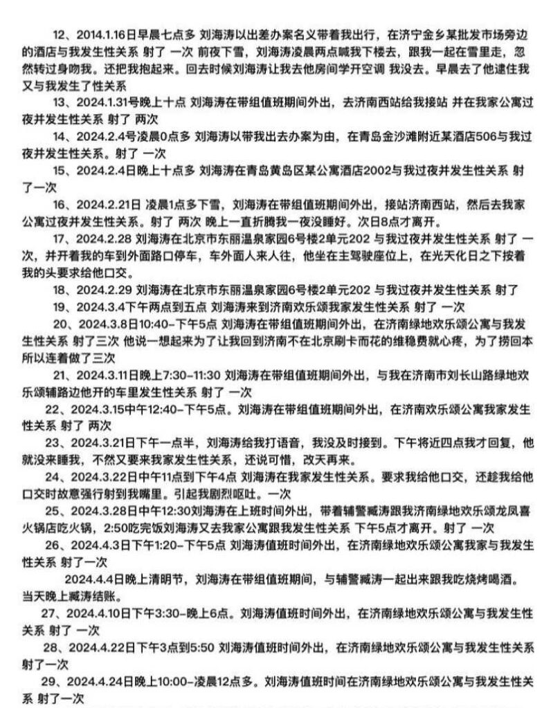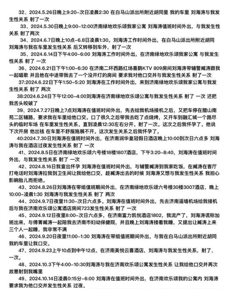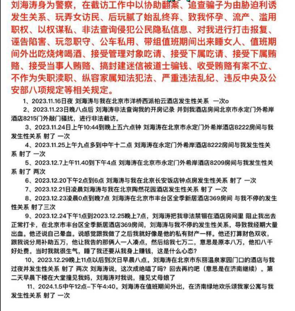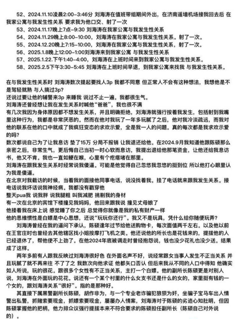 山东济南访民赵爽在公开控告中称,某派出所所长刘海涛在带组值班期间多次擅离职守并与她发生性关系;她还指控刘海涛多次提出与她及其下属辅警进行三人性行为(俗称“3P”)的要求。