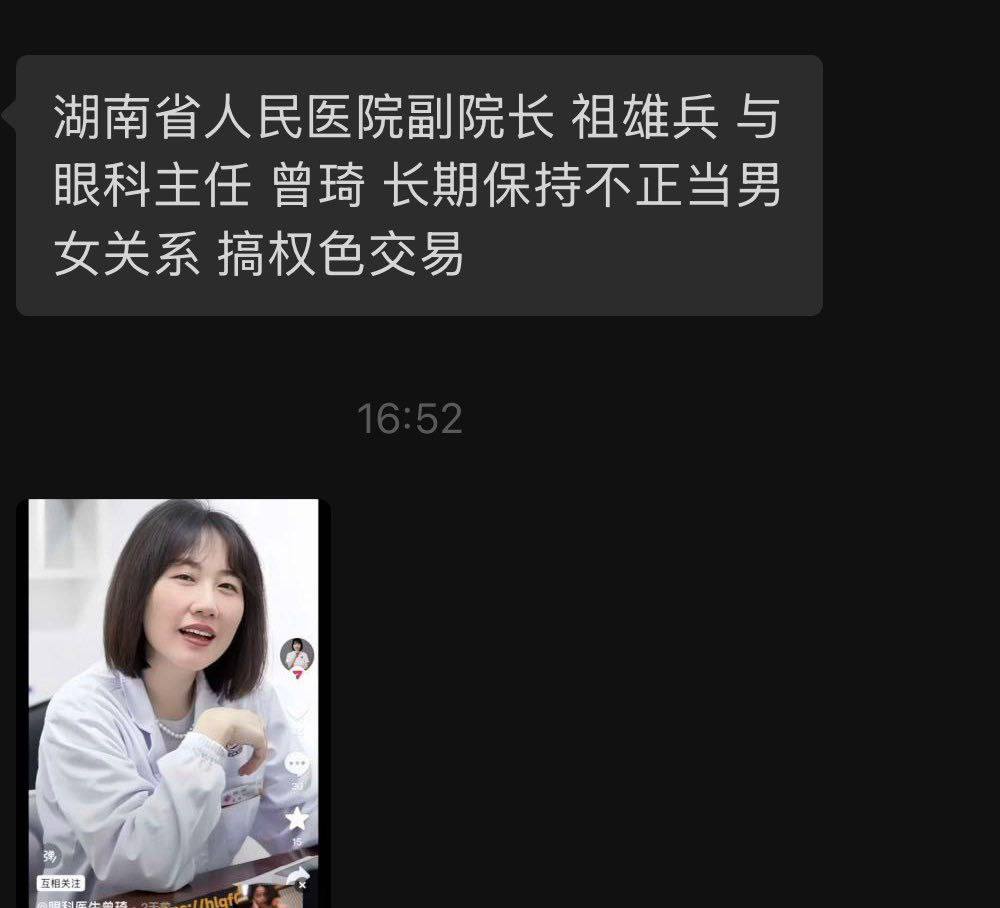 湖南省人民医院副院长祖雄兵婚内出轨眼科主任曾琦被曝光不雅视频