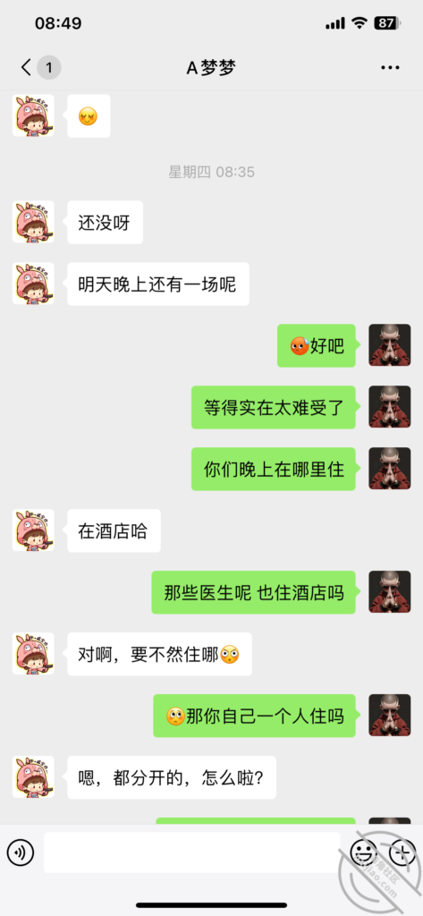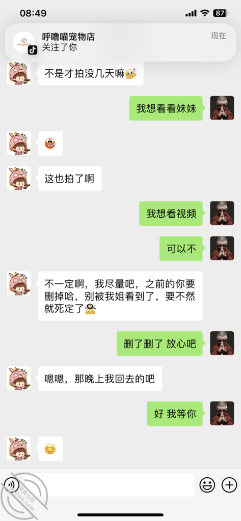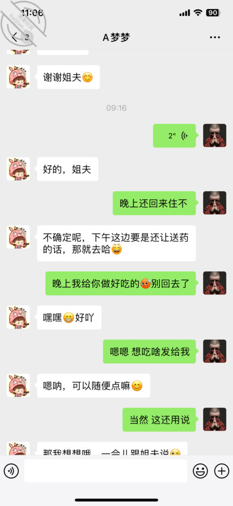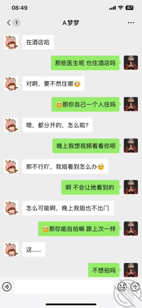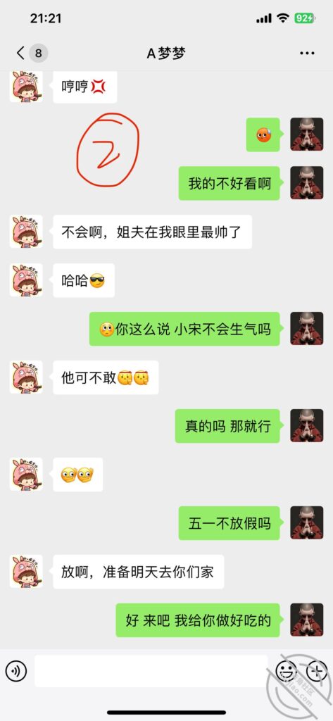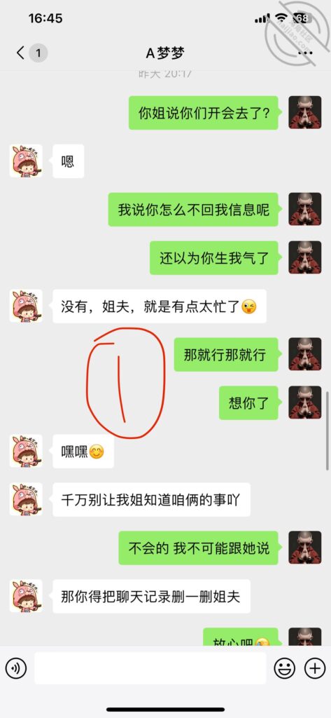 这几天出了点事,小姨子和她老公吵起来了,具体什么原因我也没细问,她又在外面出差,没时间来我这,海友们一直催我更新,我也没办法哈,聊天记录放在下面了……