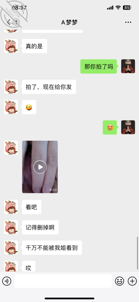 其实之前有一次我不小心看了小姨子的手机,她下楼挪车,忘拿手机了,趁她出去,我把手机拿起来,想试试密码对不对,就当玩了,没想到第一次就解开了,密码竟然是她的生日,当时我激动坏了,赶紧点开手机相册,翻一翻就看到了让我至今难忘的视频,她自拍的喂扔视频,应该是拍了发给我妹夫的,那一个扔真的又大又白,看的我下面都有感觉了,当时有点紧张,要是拿手机拍下来就好了🥹🥹,这是我第一次看到小姨子的大扔,要是能让我摸上一把那就太过瘾了🤩🤩