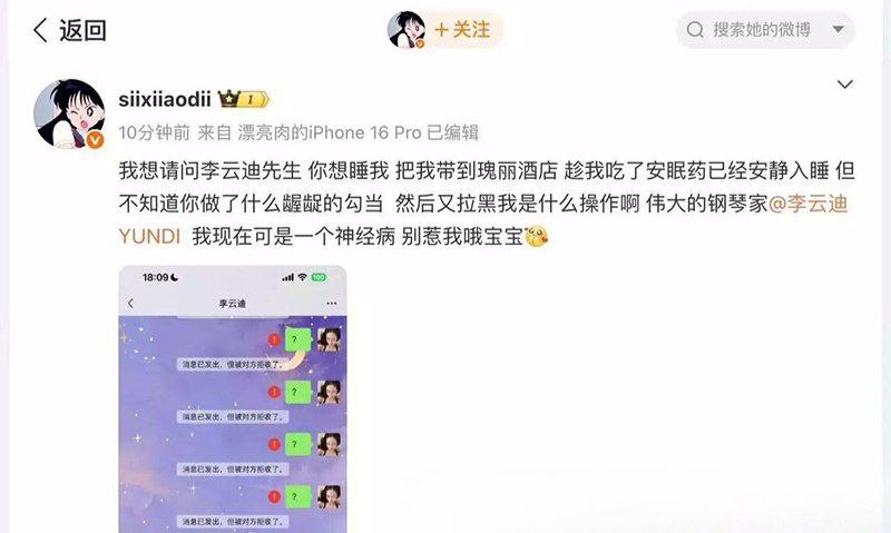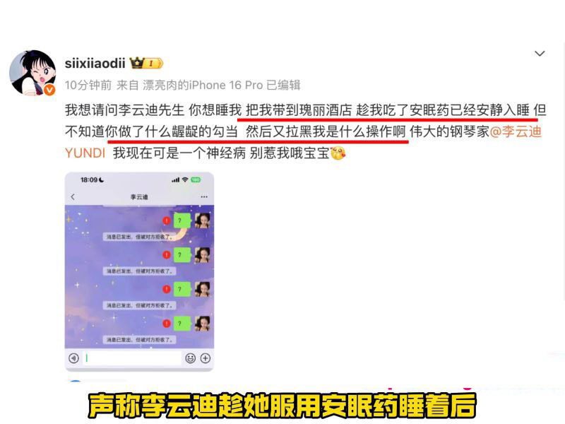 曾经在乐坛被无数小迷妹迷恋的钢琴王子李云迪,彻底跌落神坛。微博网红司晓迪公开发文指责李云迪在酒店趁她服用安眠药昏睡后,竟然对她做出猥亵行为,甚至时候把网红拉黑玩起了人间失踪。