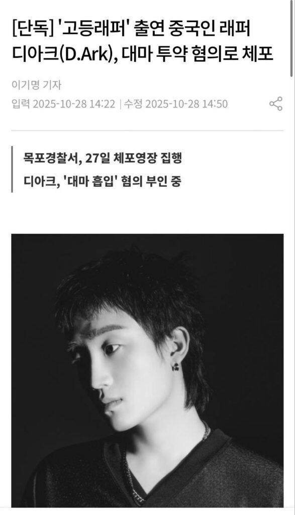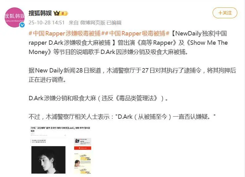 说唱圈震动!还记得凭借《Show Me The Money 777》和《高等Rapper》走红的中国天才说唱歌手D.Ark(迪雅克)吗?这位少年成名、风格叛逆的rapper,近日据媒体报道疑因涉嫌吸毒在韩国被警方拘留。