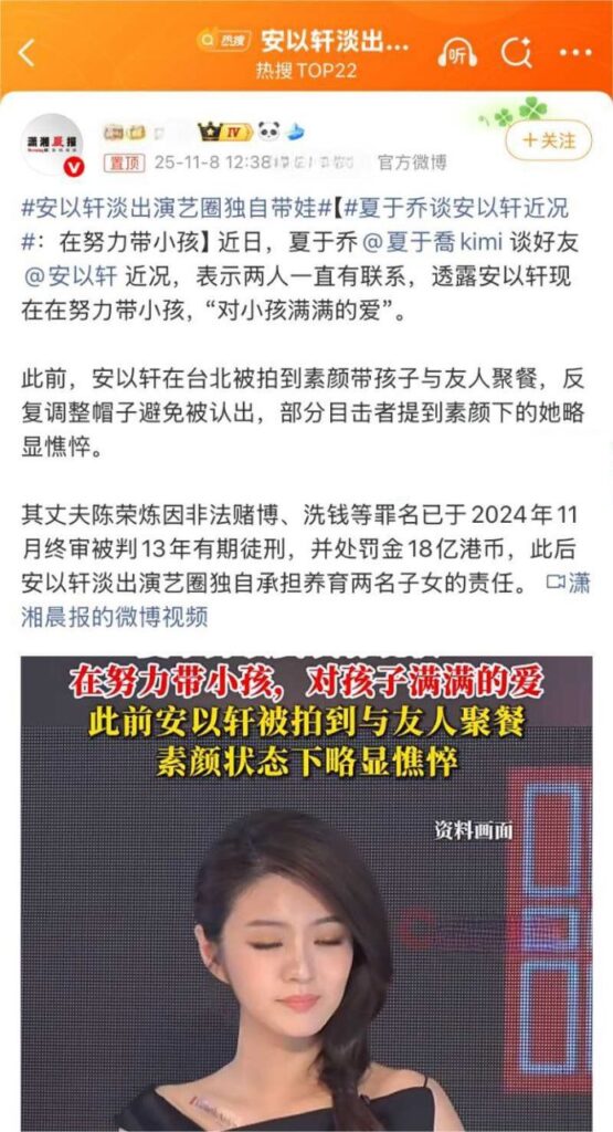 近日台湾娱乐圈再掀风波,网络上出现关于知名女演员安以轩疑似婚内出轨的传闻,且有报道称其丈夫陈熔炼因被台警方查出参与非法赌博书剑,已被判处有期徒刑13年。