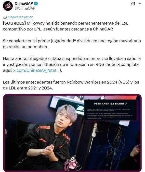 2025年11月12日,LPL对前FPX打野Milkyway(蔡子俊)作出永久禁赛。实名举报称他在效力RNG期间泄露战队BP策略,聊天记录显示曾与昵称“胡总”讨论模拟BP细节。